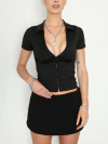 Camisa de Tejido tul con recortes en el delantero y terminación con roulotte. Tiene 4 botones en el delantero y entretela en el cuello.
