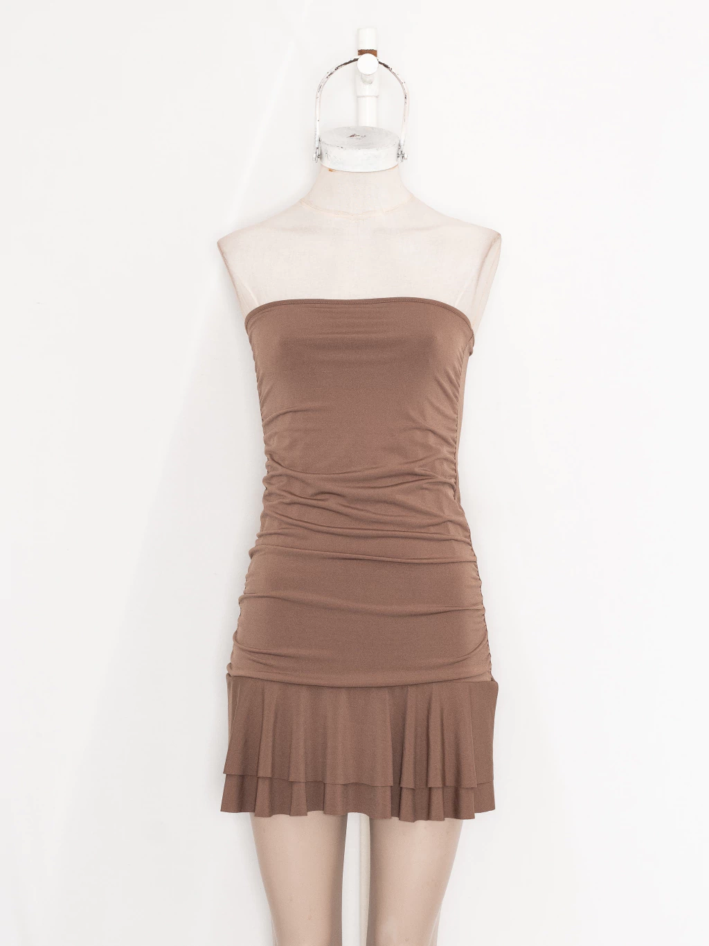 Vestido strapless de Ity con frunces en los costados y volados abajo. El delantero es doble para que no transparente.