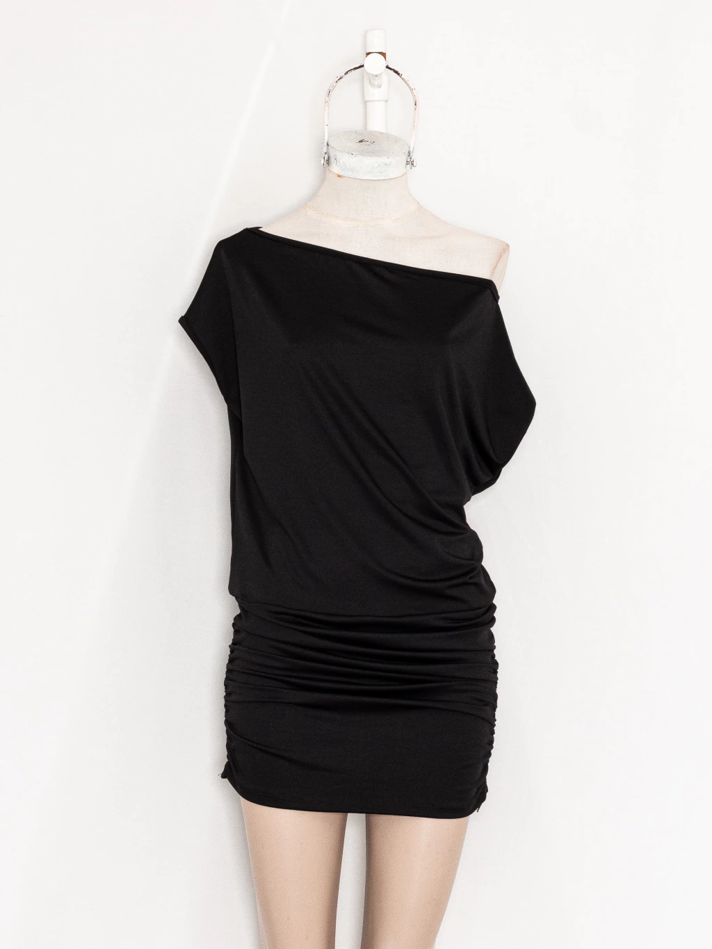 Vestido de Microfibra para usarlo un hombro caído o escote bote, tiene los costados de la cadera fruncidos.